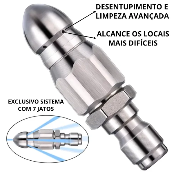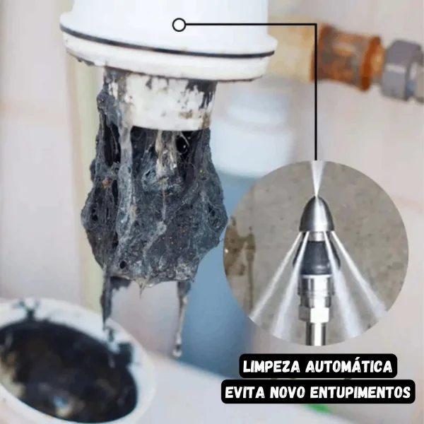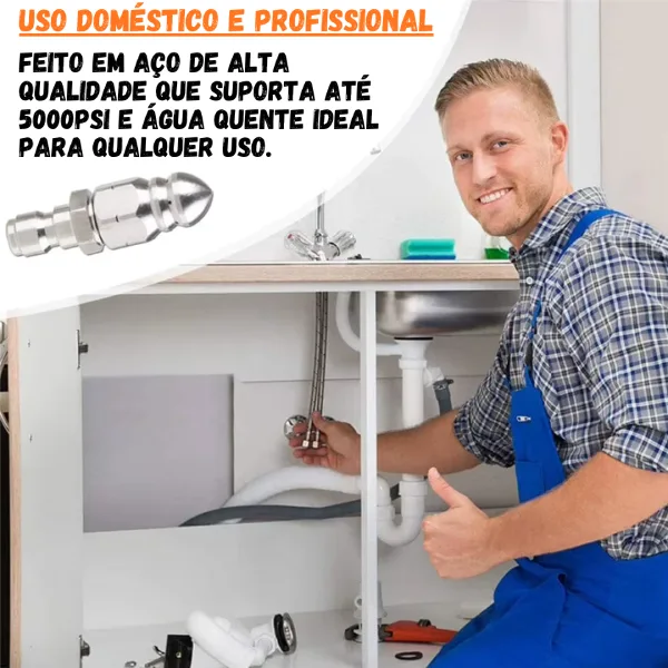 Diferente de métodos improvisados como arames ou produtos químicos, este bico entra dentro da tubulação e limpa as paredes internas do cano removendo sujeira acumulada.