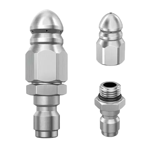 O bocal de limpeza de alta pressão utiliza jatos concentrados que desfazem bloqueios e liberam a passagem da água rapidamente. Remove sujeira, densentope ralos e restaura a passagem da água.