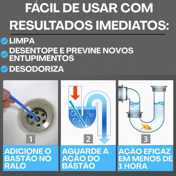 Limpa, desodoriza e previne novos entupimentos com. Tudo em um único bastão do EnziPower™ - Kit Bastão Desentupidores de Pia.